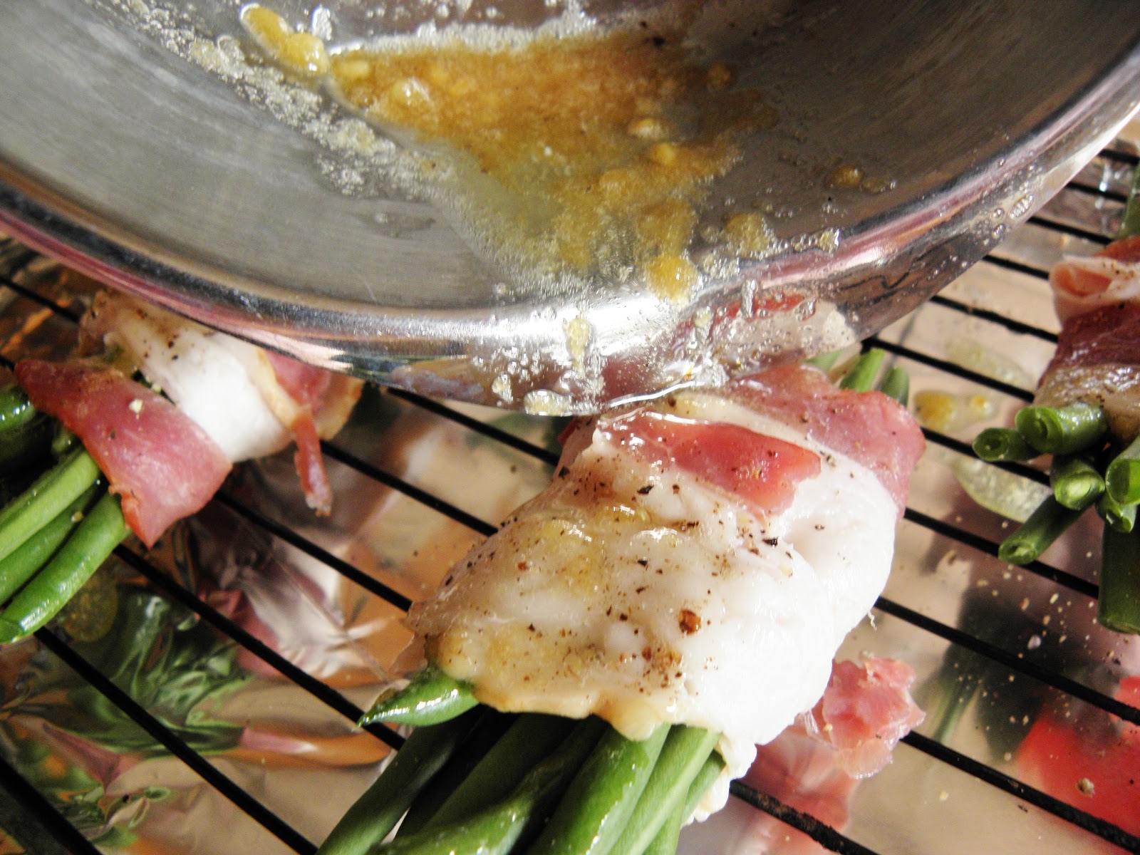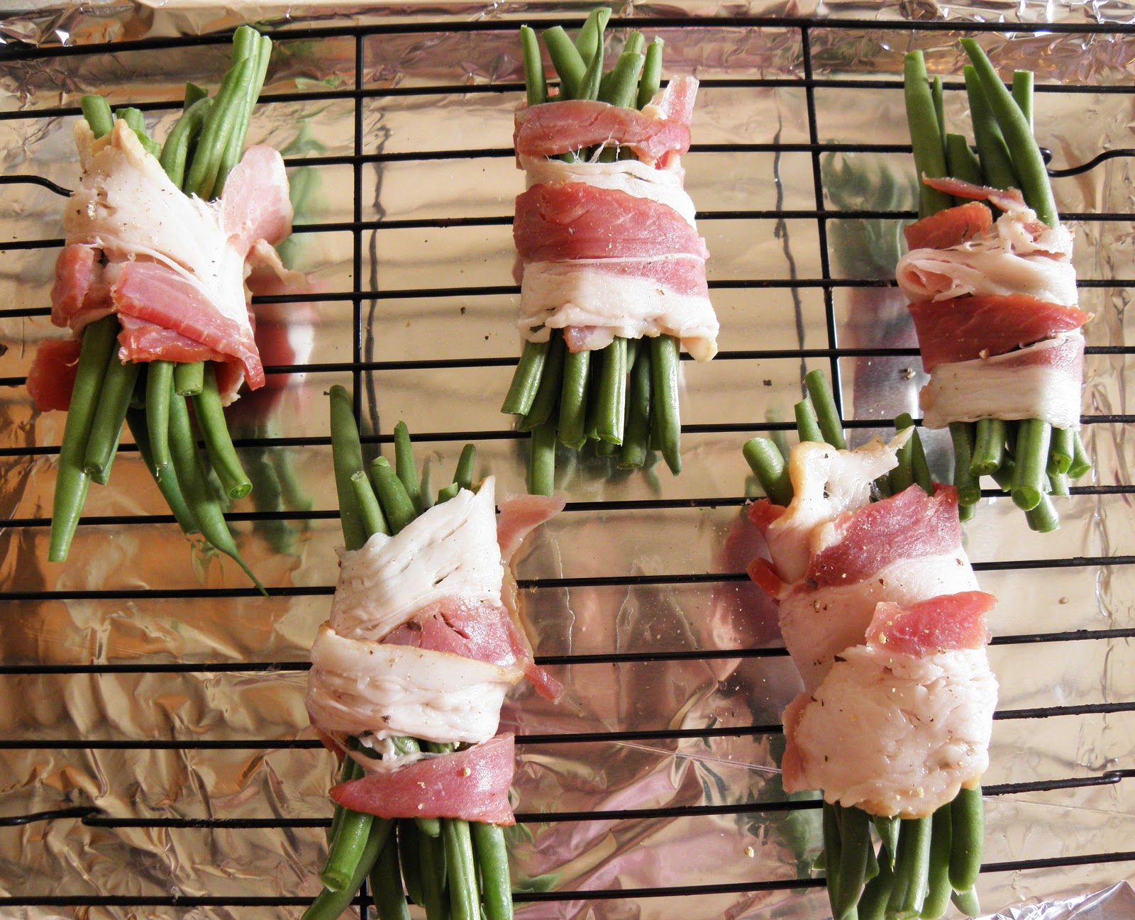Wash and dry the green beans well. Season with salt and pepper. Bundle about 6-8 green beans and take a slice of bacon and wrap around the center of the green bean bundle. They don’t have to be perfect! Lay the bundle with the seam side down on the rack. Do this to all the green beans. They can touch in the pan if you make a large batch, but since I only made a few for us two I scattered them out.
