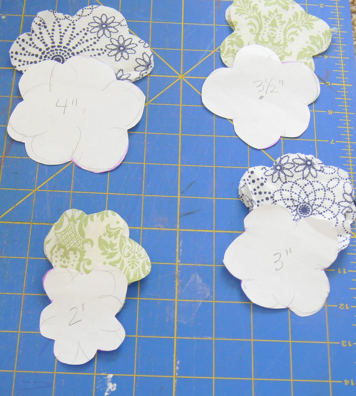 I free-handed some flowers of different sizes. I cut out 2 4″ flowers, 2 3 1/2″ flowers, 4 3″ flowers and 4 2″ flowers. Then I stacked and turned the 4″ and the 3 1/2″ flowers: