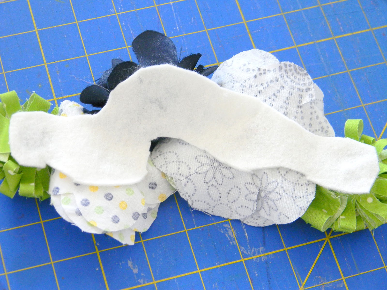 For my belt, I used 2 of flower #1 and 2 of flower #3 and a third flower that I made using the same technique I did here. I laid them out on white felt in an arrangement that I liked. Then I glued them to the felt: