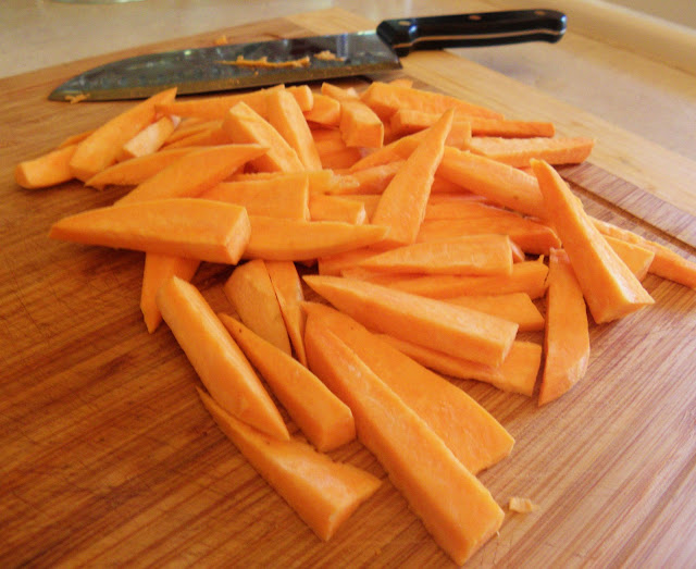 Preheat oven to 400 degrees. Slice the potatoes in half width-wise, then half length-wise. Proceed to slice potatoes into small wedges. Please be careful-sweet potatoes are more difficult to cut than white potatoes.