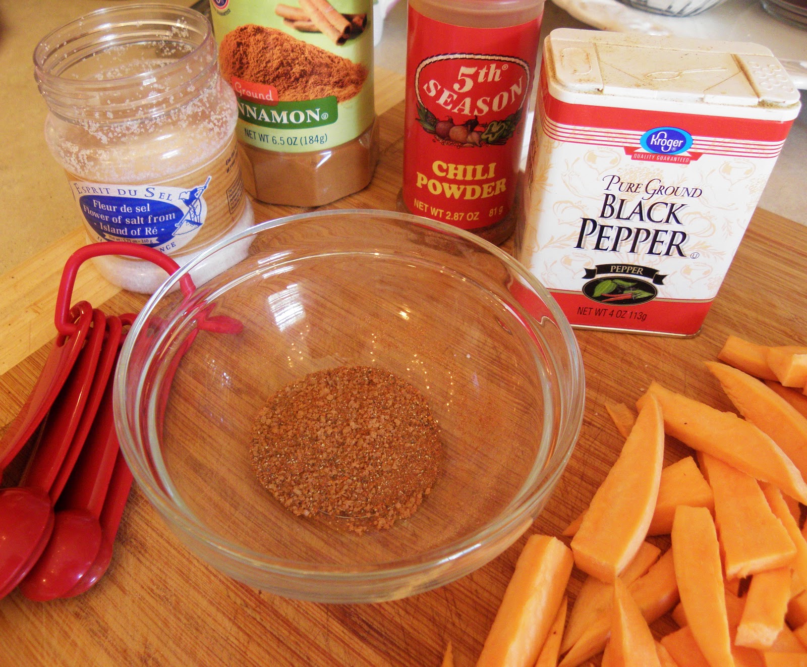 In a small bowl, combine the spices. I use a heaping scoop of the chili powder because I like the contrast. Feel free to adjust to suit your family’s taste.