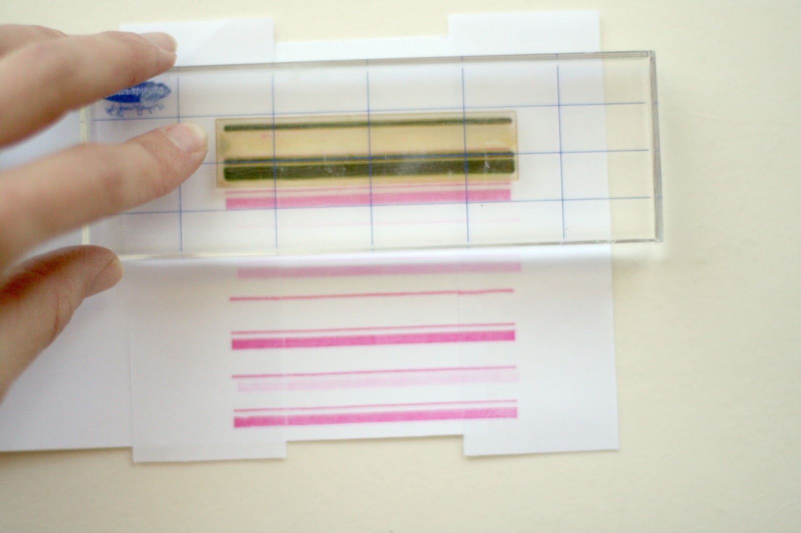 First, put two pieces of copy paper at the beginning and end of where you want your plaid. This is called a mask, and serves to prevent any ink from going beyond those edges. Stamp pink lines across the card.