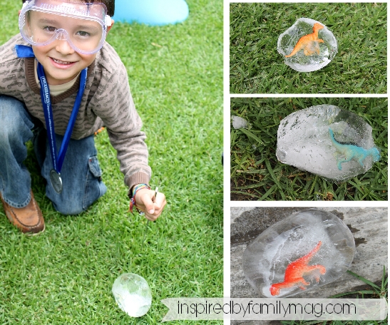 How to: I used both hands to open wide the balloon and then I had my 6 year old insert the dinosaur. I filled up the balloon with water and then tied a knot. Freeze them over night. Some weren’t totally frozen by the next day but it was fine because it made it easier to crack open.